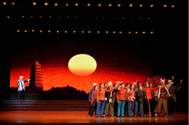歌舞劇《南泥灣》以陜北青年腰鼓、窗花為男女主人公,通過安塞腰鼓、陜北說書、陜北民歌等典型黃土風(fēng)情文化元素,展示陜北元素,講述紅色故事,全方位、多角度地展現(xiàn)了上世紀(jì)4 0 年代初發(fā)生在南泥灣轟轟烈烈的大生產(chǎn)運(yùn)動(dòng)以及在大生產(chǎn)運(yùn)動(dòng)中產(chǎn)生的“自力更生、艱苦奮斗”的南泥灣精神,傳頌勞模精神、禮贊工匠精神、弘揚(yáng)延安精神。