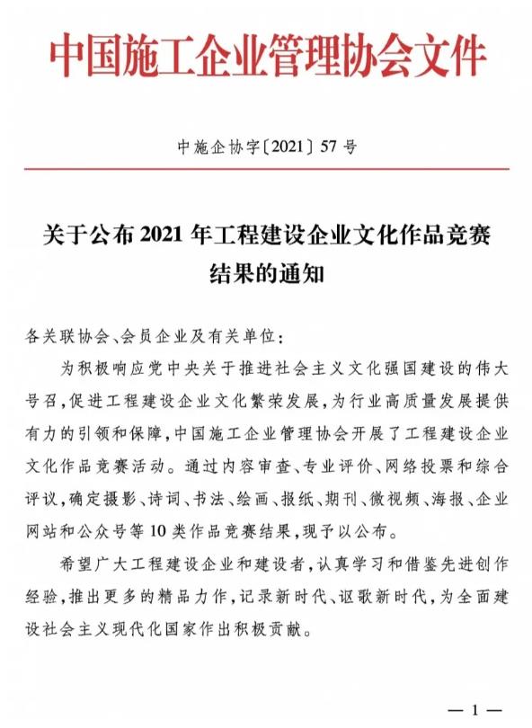 近日,中國施工企業(yè)管理協(xié)會公布了2021年工程建設(shè)企業(yè)文化作品競賽獲獎名單。陜建十三建集團(tuán)企業(yè)官網(wǎng)和微信公眾號分別榮獲優(yōu)秀獎。