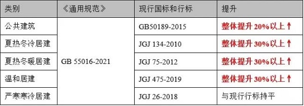 《通用規(guī)范》提高了居住建筑、公共建筑的熱工性能限值要求,與大部分地區(qū)現(xiàn)行節(jié)能標(biāo)準(zhǔn)不同,平均設(shè)計(jì)能耗水平在現(xiàn)行節(jié)能設(shè)計(jì)國家標(biāo)準(zhǔn)和行業(yè)標(biāo)準(zhǔn)的基礎(chǔ)上分別降低 30%和 20%。