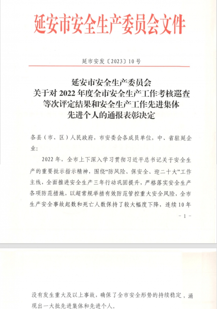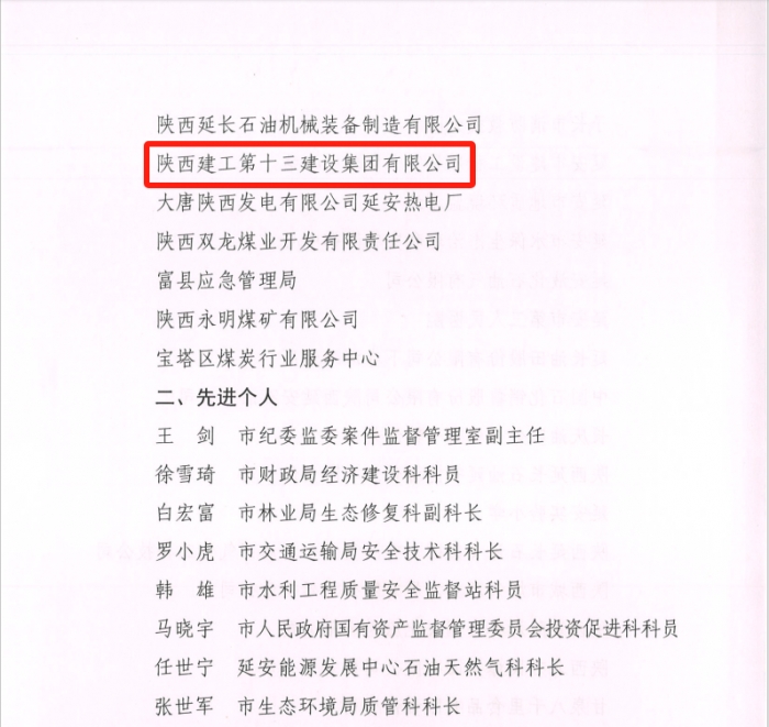 近日,延安市安全生產(chǎn)委員會(huì)表彰了2022年全市安全生產(chǎn)工作先進(jìn)集體和先進(jìn)個(gè)人,陜建十三建集團(tuán)獲評延安市安全生產(chǎn)先進(jìn)集體,這是集團(tuán)連續(xù)四年榮獲全市安全生產(chǎn)先進(jìn)集體表彰。