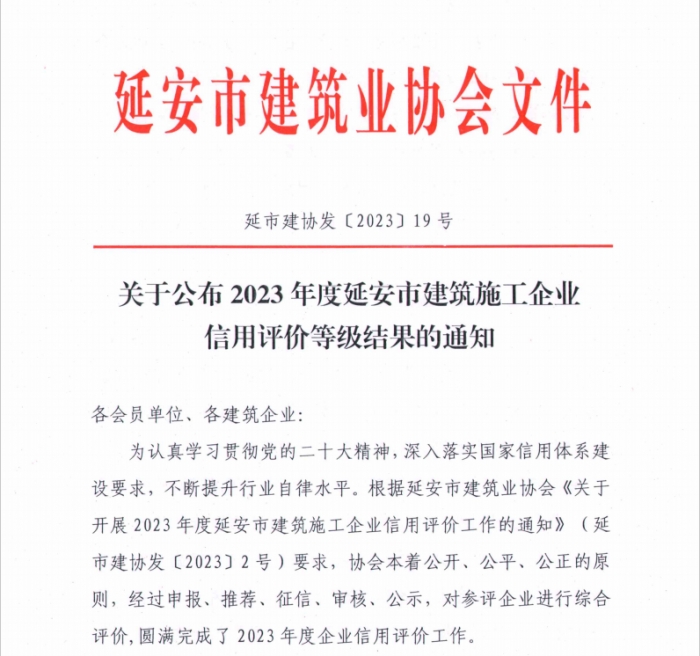 同時(shí),延安市建協(xié)公布了2023年度延安市建筑施工企業(yè)信用評級結(jié)果:陜建十三建集團(tuán)被評為AAA級企業(yè)。