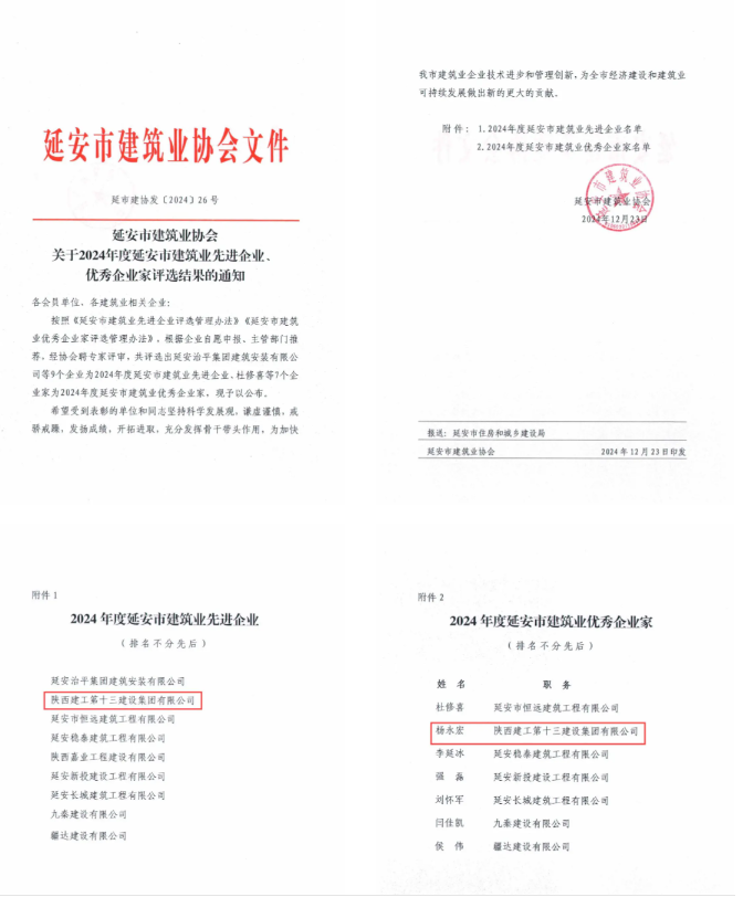 2024年,在延安市委、市政府和陜建集團黨委的堅強領(lǐng)導下,十三建集團貫通落實黨的二十屆三中全會精神和習近平總書記歷次來陜考察重要講話重要指示,踐行“11359”工作方針,突出經(jīng)營提質(zhì)、改革蓄能、管理強基、品牌增效、黨建聚力“五個抓手”,沉著應(yīng)變、綜合施策,在復雜的環(huán)境和不利的行業(yè)形勢中穩(wěn)步前行,先后榮獲延安市建筑業(yè)穩(wěn)增長優(yōu)秀企業(yè)、全國工程建設(shè)AAA級信用企業(yè)等榮譽。