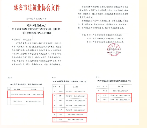 日前,延安市建筑業(yè)協(xié)會公布了2024年度延安市建筑業(yè)先進企業(yè)、優(yōu)秀企業(yè)家、項目經(jīng)理部、項目經(jīng)理、項目總工評選結(jié)果,陜西建工第十三建設(shè)集團有限公司被評為2024年度延安市建筑業(yè)先進企業(yè);集團黨委副書記、總經(jīng)理楊永宏同志被評為優(yōu)秀企業(yè)家;師范路綜合整治項目部被評為建設(shè)工程優(yōu)秀項目部;雷慧東、上官松、拓振華、袁江、喬戰(zhàn)峰五名同志被評為優(yōu)秀項目經(jīng)理;汪洋、王海紅兩名同志被評為優(yōu)秀項目總工。