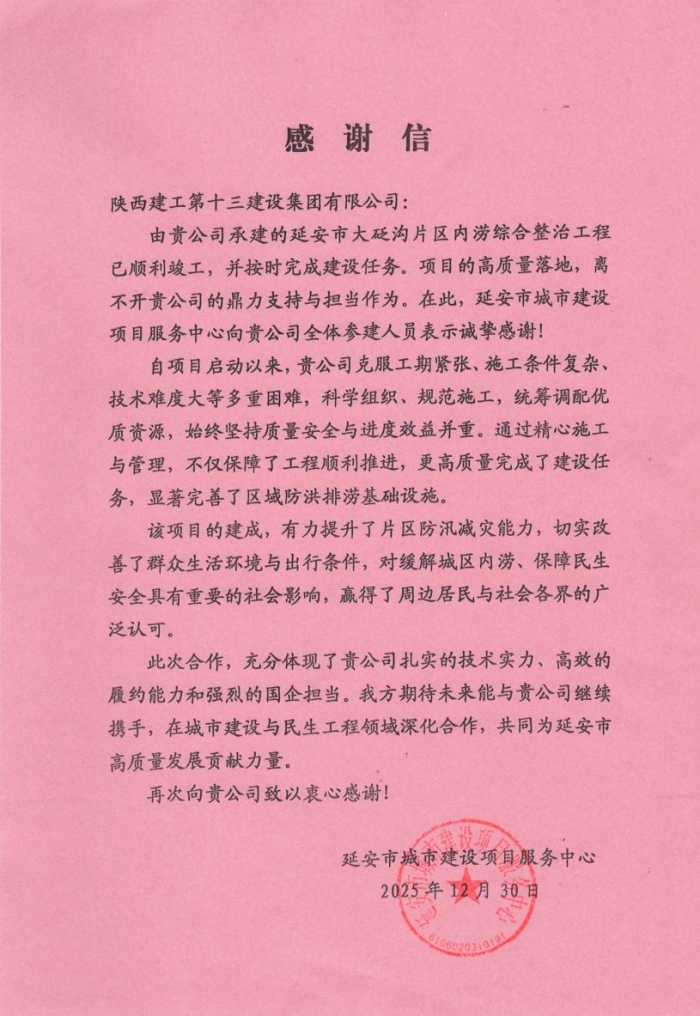 延安市城市建設(shè)項目服務(wù)中心向集團致感謝信,充分肯定了集團為延安市大砭溝內(nèi)澇綜合治理工程付出的艱辛努力與卓越貢獻(xiàn)。信中指出,自項目啟動以來,集團在克服工期緊張,施工條件復(fù)雜,技術(shù)難度大等多重因素,科學(xué)組織、規(guī)范實施,統(tǒng)籌調(diào)配優(yōu)質(zhì)資源,高質(zhì)量完成建設(shè)任務(wù),顯著完善了區(qū)域防洪排澇基礎(chǔ)設(shè)施。充分彰顯了集團扎實的技術(shù)實力,高效的履約能力和強烈的國企擔(dān)當(dāng),贏得了周邊居民和社會各界的廣泛認(rèn)可。