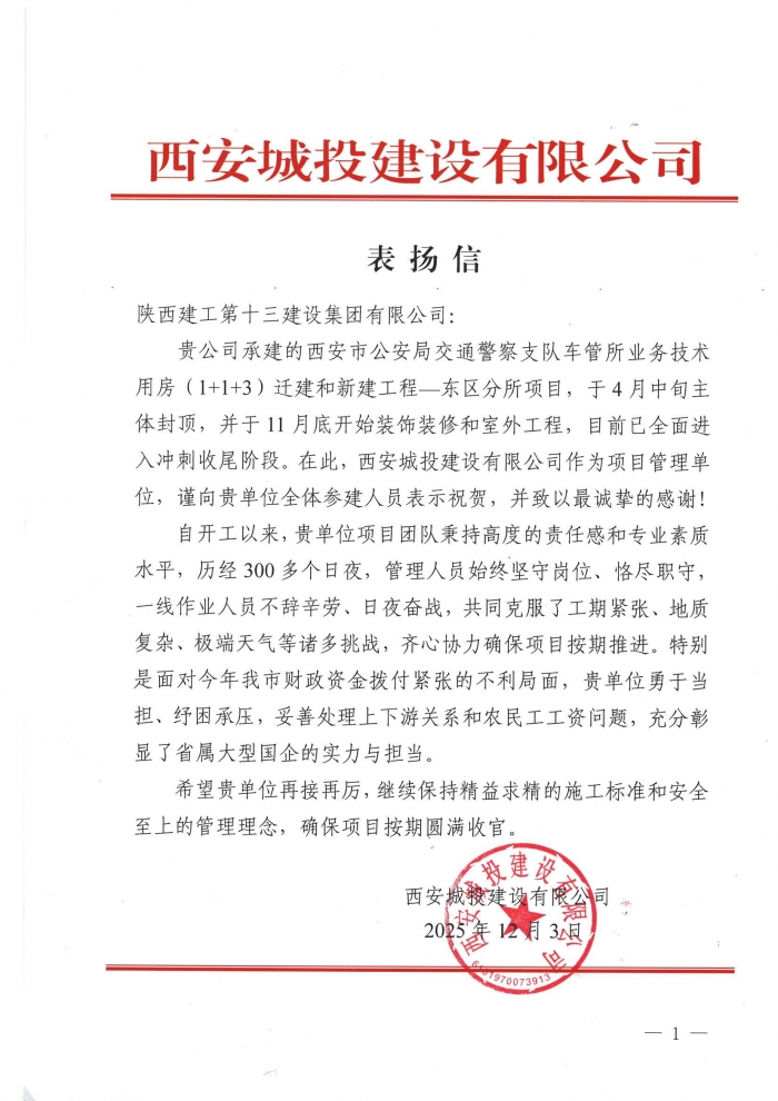 西安城投建設(shè)有限公司向集團致表揚信,對集團承建的西安市公安局交通警察支隊車管所業(yè)務(wù)技術(shù)用房(1+1+3)拆遷和新建工程─東區(qū)分所項目致以表揚。信中指出,項目歷經(jīng)300多個日夜,建設(shè)人員不辭辛勞、日夜奮戰(zhàn),克服工期緊張、地質(zhì)復(fù)雜、極端天氣等諸多挑戰(zhàn),齊心協(xié)力推進(jìn)項目順利實施。特別在面對資金緊張,集團勇于擔(dān)當(dāng)、紓困承壓,積極協(xié)調(diào)各方關(guān)系,穩(wěn)妥處理農(nóng)民工工資問題,充分彰顯了國有企業(yè)的實力與擔(dān)當(dāng)。希望集團能繼續(xù)保持精益求精的施工標(biāo)準(zhǔn)和安全生產(chǎn)保障,確保項目按期圓滿收官。