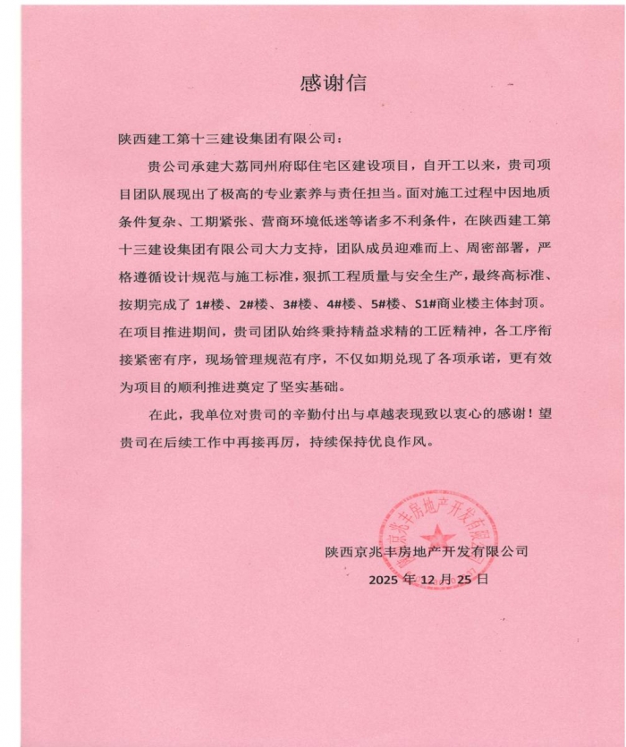 陜西京兆豐房地產(chǎn)開發(fā)有限公司向集團致感謝信,對集團承建的大荔同州府邸住宅區(qū)建設(shè)項目展現(xiàn)出的極高專業(yè)素養(yǎng)與責(zé)任擔(dān)當(dāng)致以感謝。信中指出,集團項目團隊克服地質(zhì)條件復(fù)雜、工期緊張、營商環(huán)境低迷等不利因素,通過迎難而上、緊密銜接、規(guī)范管理,順利實現(xiàn)多棟住宅樓及商業(yè)樓主體封頂。希望集團再接再厲,繼續(xù)保持優(yōu)良作風(fēng),確保按期完成建設(shè)任務(wù)交付使用。